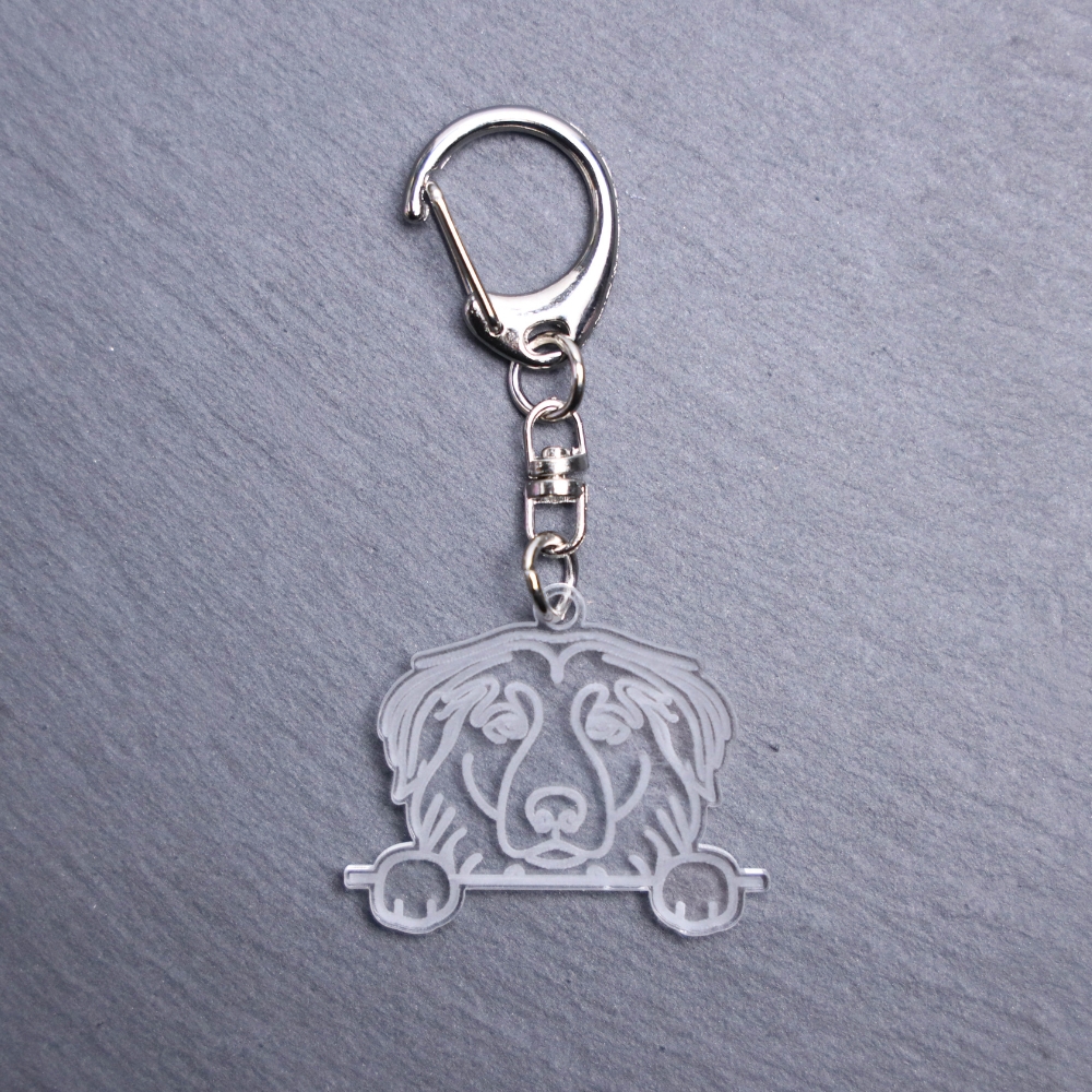 Afghan Shepherd Bag Tag. This bag tag is made with engraved acrylic. Comes with lobster clasp topper that easily hooks to a bag, zippers, keychains, and lanyards for fun display and swivels. Clear opposite backside.