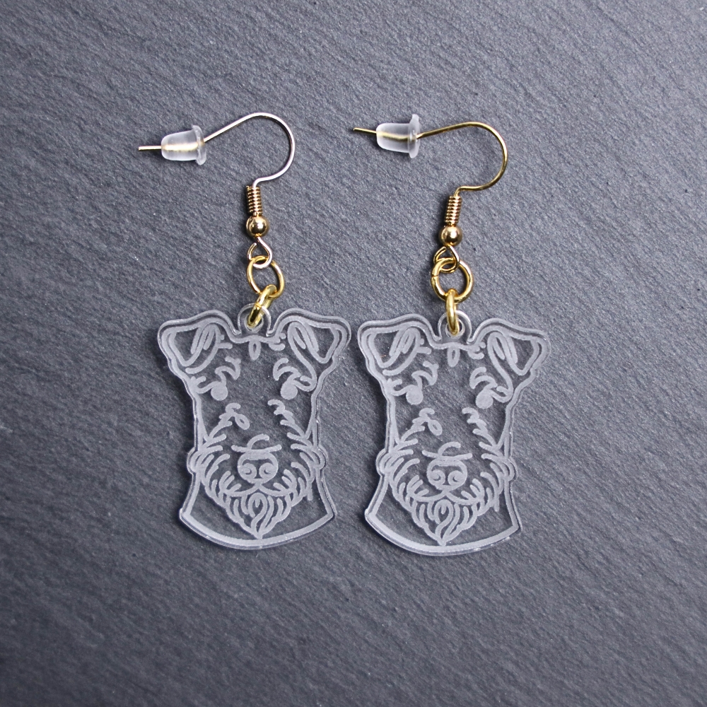 Airedale Terrier Earrings. These earrings are made with engraved acrylic. Comes with gold hooks that is nickel free. Adorable dangle earrings for dog lovers.