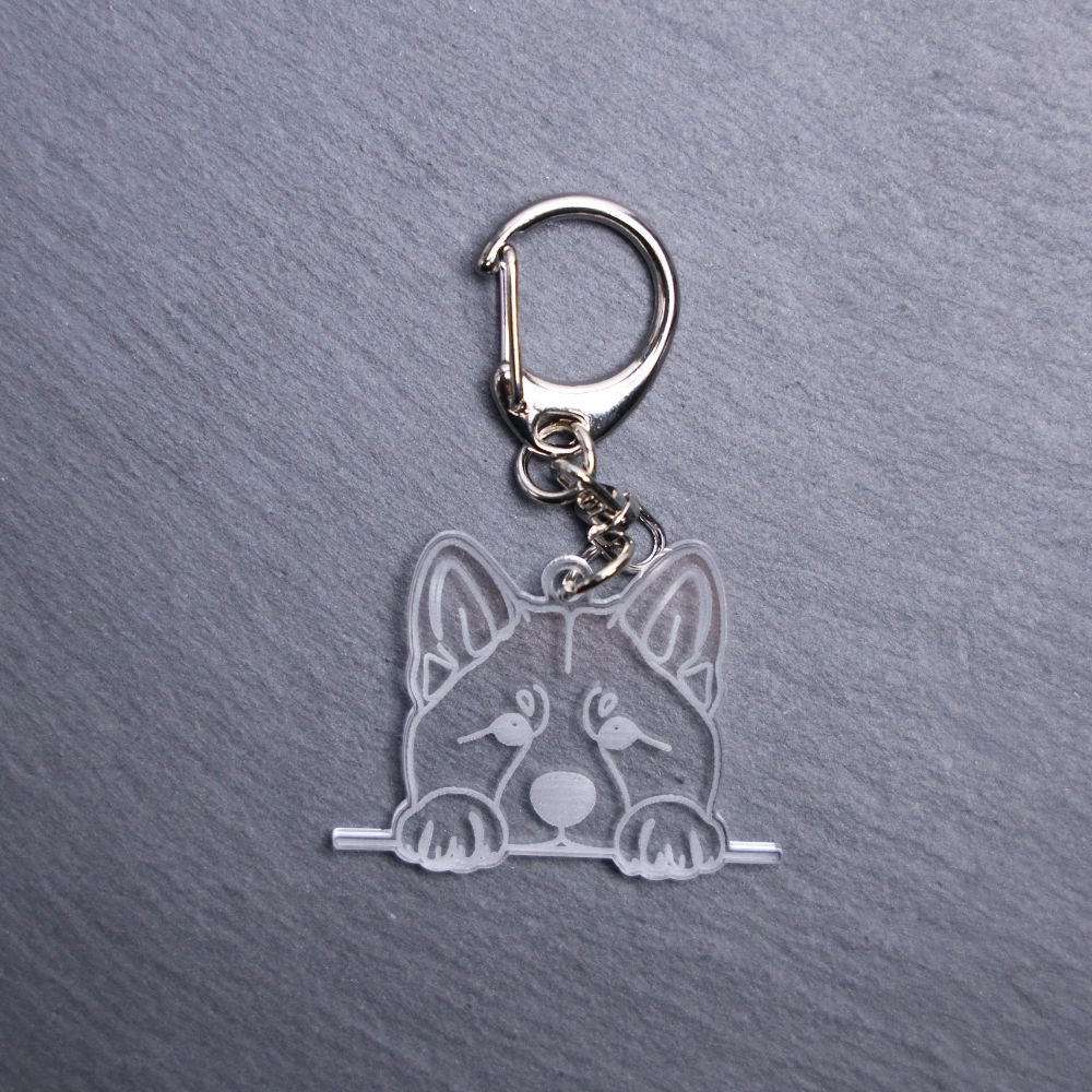 Akita Bag Tag. This bag tag is made with engraved acrylic. Comes with lobster clasp topper that easily hooks to a bag, zippers, keychains, and lanyards for fun display and swivels. Clear opposite backside.