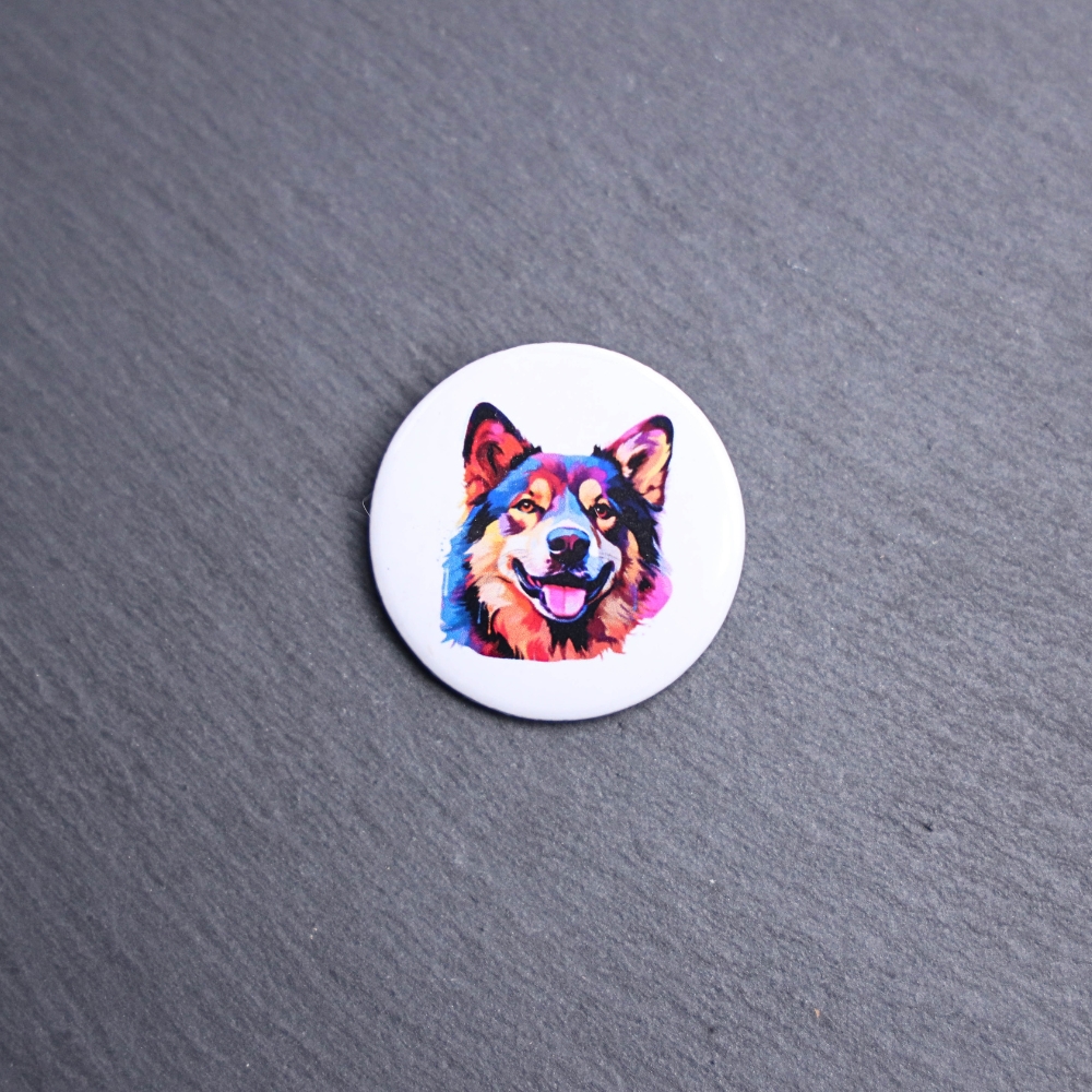 Akita Watercolor Button. These buttons are made with photo paper, metal round, and metal backing. These buttons are vibrant and fun to use on bags or vests.