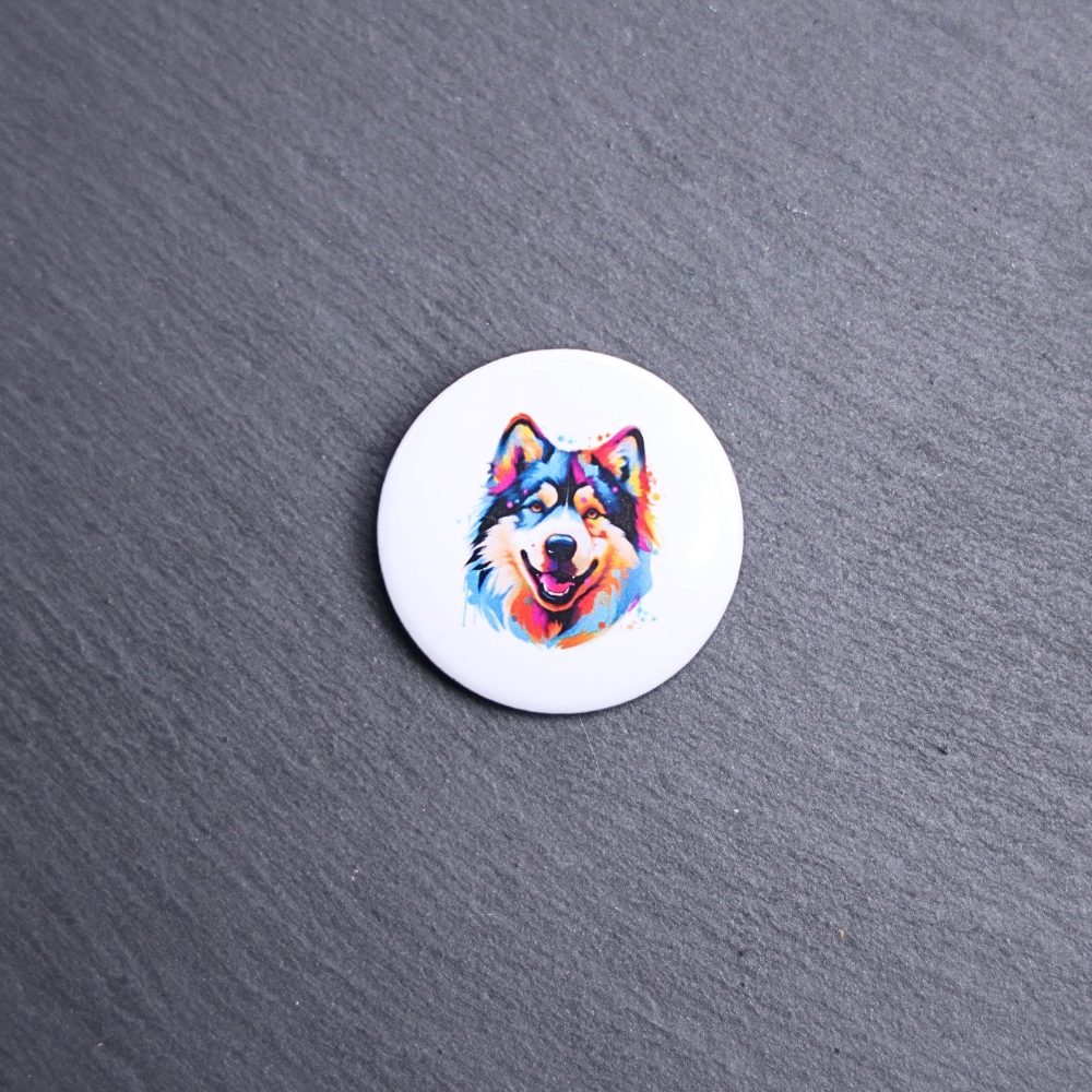 Alaskan Malamute Watercolor Button. These buttons are made with photo paper, metal round, and metal backing. These buttons are vibrant and fun to use on bags or vests.