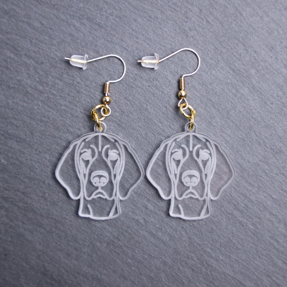 American English Coonhound Earrings. These earrings are made with engraved acrylic. Comes with gold hooks that is nickel free. Adorable dangle earrings for dog lovers.