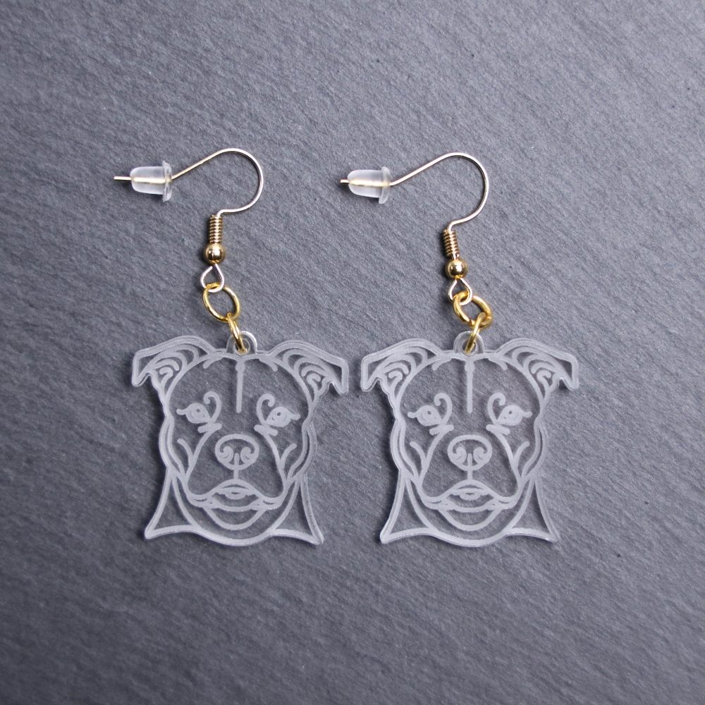 American Staffordshire Terrier Earrings. These earrings are made with engraved acrylic. Comes with gold hooks that is nickel free. Adorable dangle earrings for dog lovers.