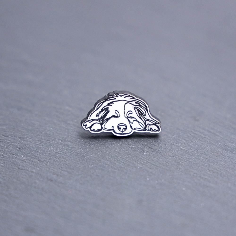 Australian Shepherd Engraved Acrylic Pin. These acrylic pins are made with engraved cast acrylic. These pins are white and black with a black pin back.