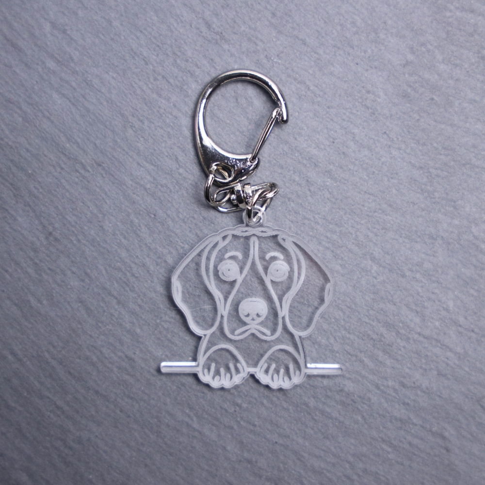 Beagle Bag Tag. This bag tag is made with engraved acrylic. Comes with lobster clasp topper that easily hooks to a bag, zippers, keychains, and lanyards for fun display and swivels. Clear opposite backside.