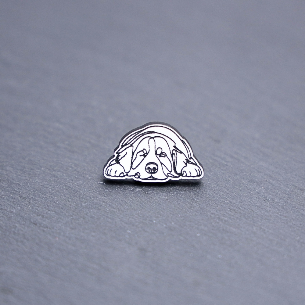Bernese Mountain Dog Engraved Acrylic Pin. These acrylic pins are made with engraved cast acrylic. These pins are white and black with a black pin back.