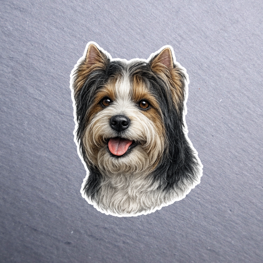 Biewer Terrier Sticker. These stickers are made with printable vinyl with a vinyl top coat that is scratch-resistant and water resistant. Put one on your phone case, laptop, iPad, hard cooler; the possibilities are endless.