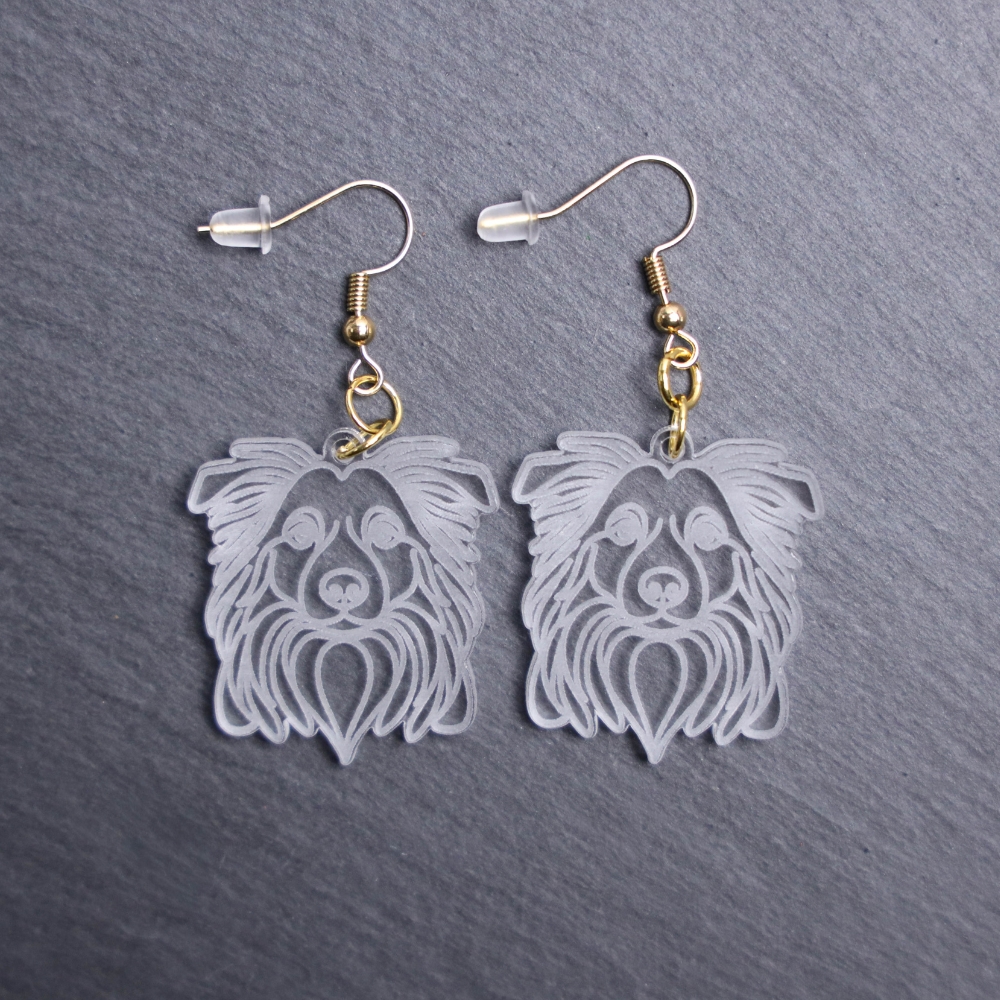 Border Collie Earrings. These earrings are made with engraved acrylic. Comes with gold hooks that is nickel free. Adorable dangle earrings for dog lovers.