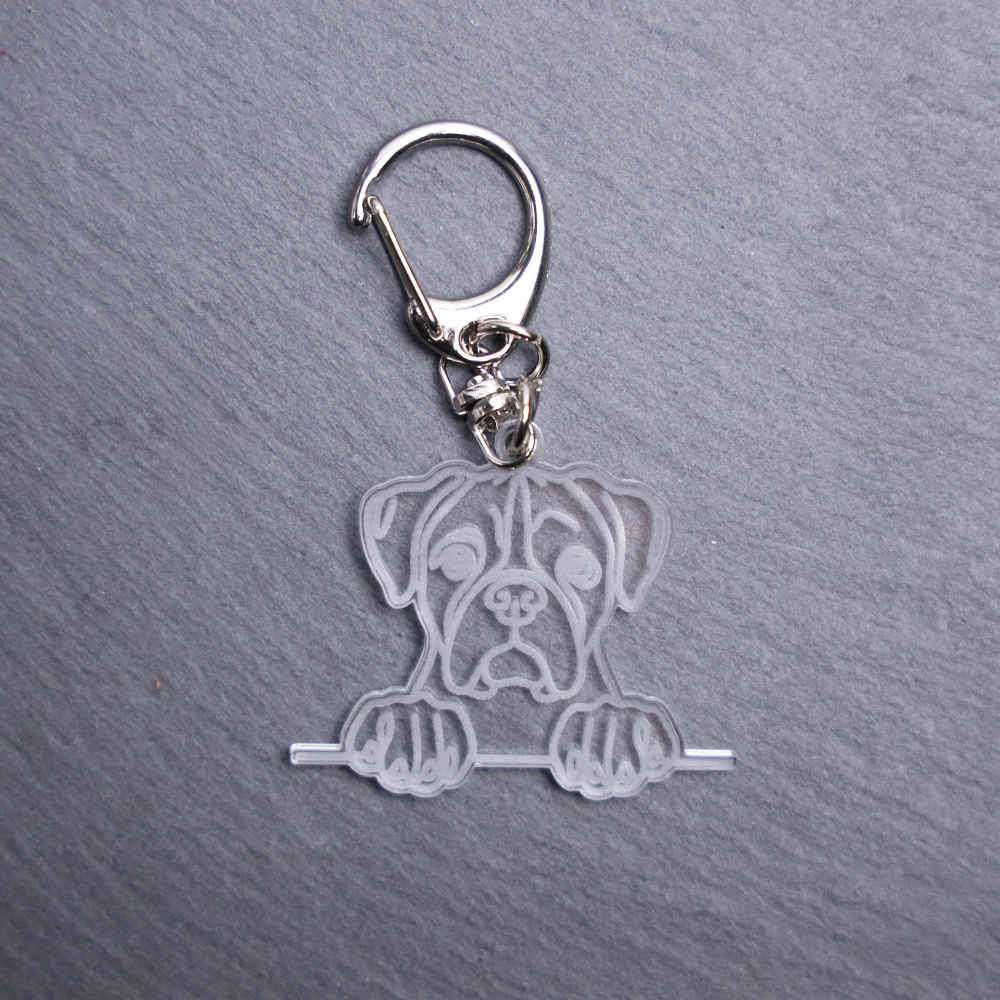 Boxer Bag Tag. This bag tag is made with engraved acrylic. Comes with lobster clasp topper that easily hooks to a bag, zippers, keychains, and lanyards for fun display and swivels. Clear opposite backside.