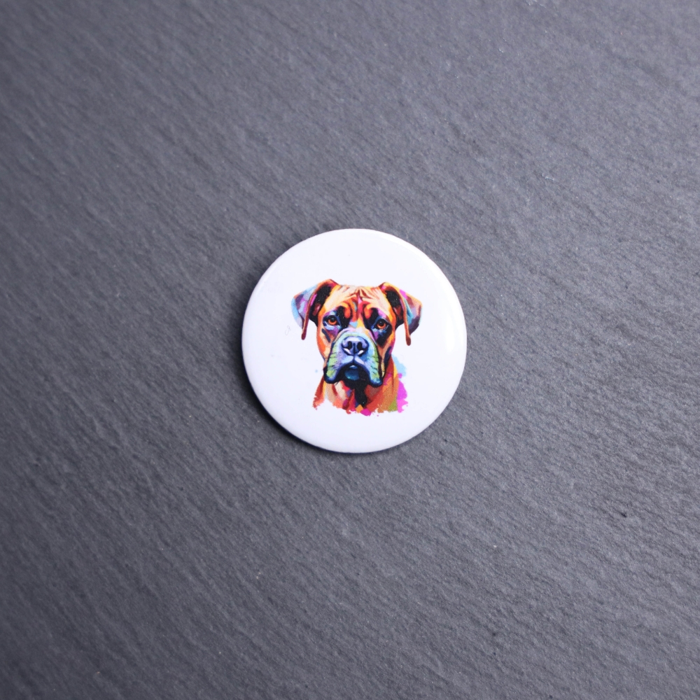 Boxer Watercolor Button. These buttons are made with photo paper, metal round, and metal backing. These buttons are vibrant and fun to use on bags or vests.