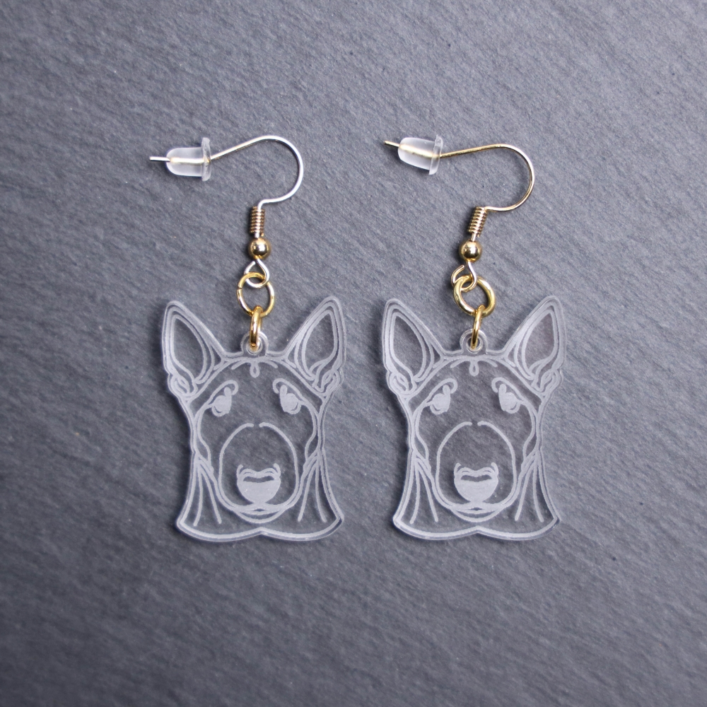 Bull Terrier Earrings. These earrings are made with engraved acrylic. Comes with gold hooks that is nickel free. Adorable dangle earrings for dog lovers.