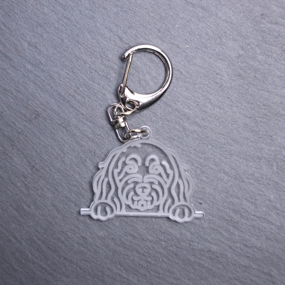 Cockapoo Bag Tag. This bag tag is made with engraved acrylic. Comes with lobster clasp topper that easily hooks to a bag, zippers, keychains, and lanyards for fun display and swivels. Clear opposite backside.