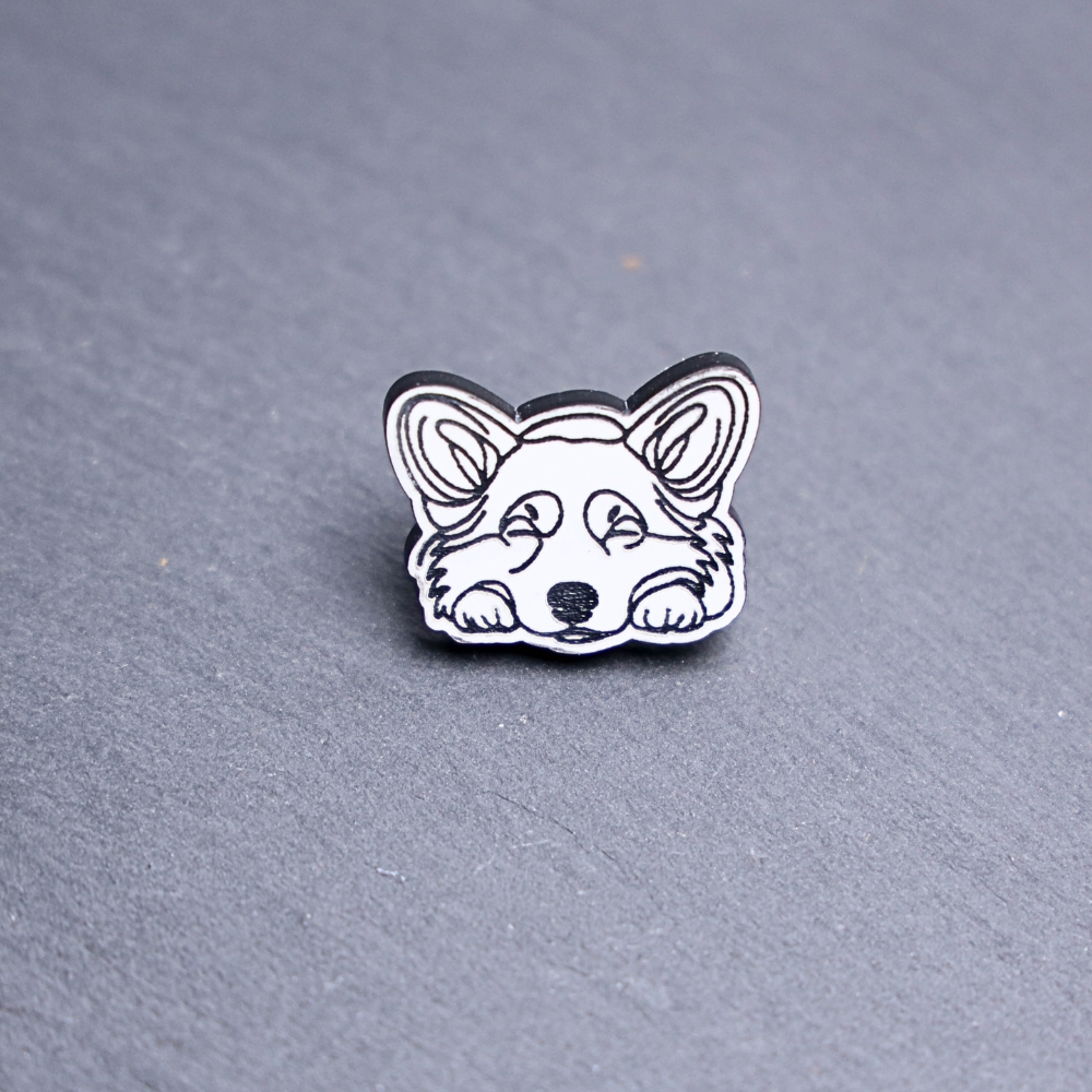 Corgi Engraved Acrylic Pin. These acrylic pins are made with engraved cast acrylic. These pins are white and black with a black pin back.
