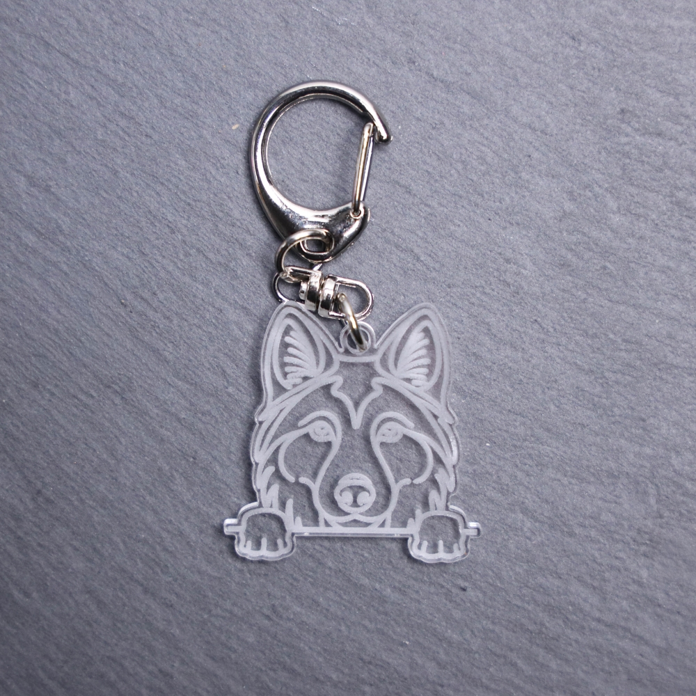 Czech Wolfdog Bag Tag. This bag tag is made with engraved acrylic. Comes with lobster clasp topper that easily hooks to a bag, zippers, keychains, and lanyards for fun display and swivels. Clear opposite backside.