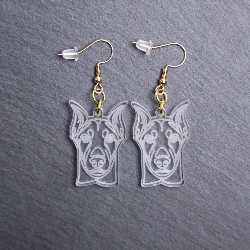 Doberman Pinscher Earrings. These earrings are made with engraved acrylic. Comes with gold hooks that is nickel free. Adorable dangle earrings for dog lovers.