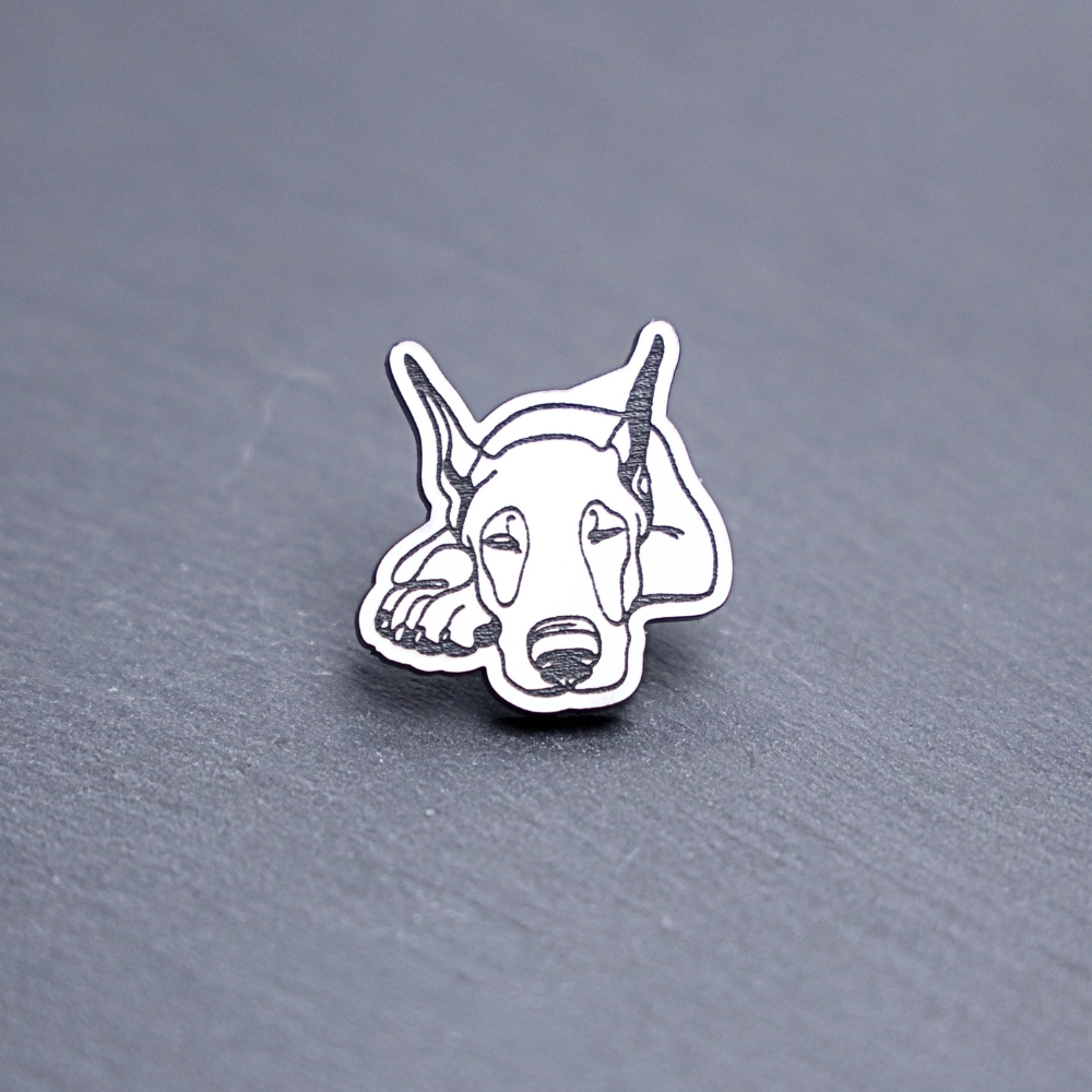 Doberman Pinscher Engraved Acrylic Pin. These acrylic pins are made with engraved cast acrylic. These pins are white and black with a black pin back.