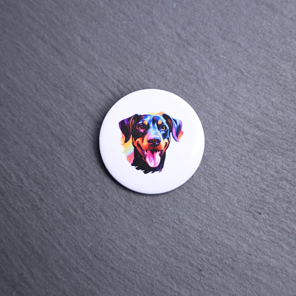 Dobermann Watercolor Button. These buttons are made with photo paper, metal round, and metal backing. These buttons are vibrant and fun to use on bags or vests.