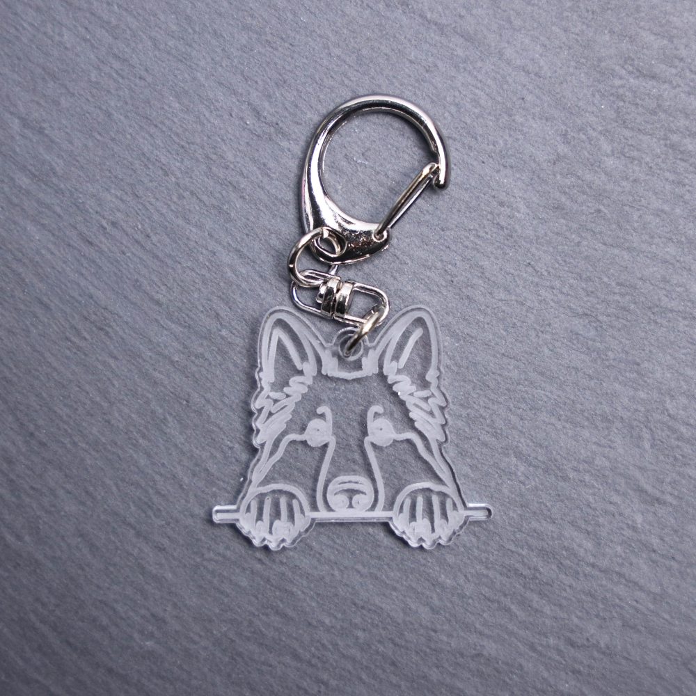 Dutch Shepherd Bag Tag. This bag tag is made with engraved acrylic. Comes with lobster clasp topper that easily hooks to a bag, zippers, keychains, and lanyards for fun display and swivels. Clear opposite backside.