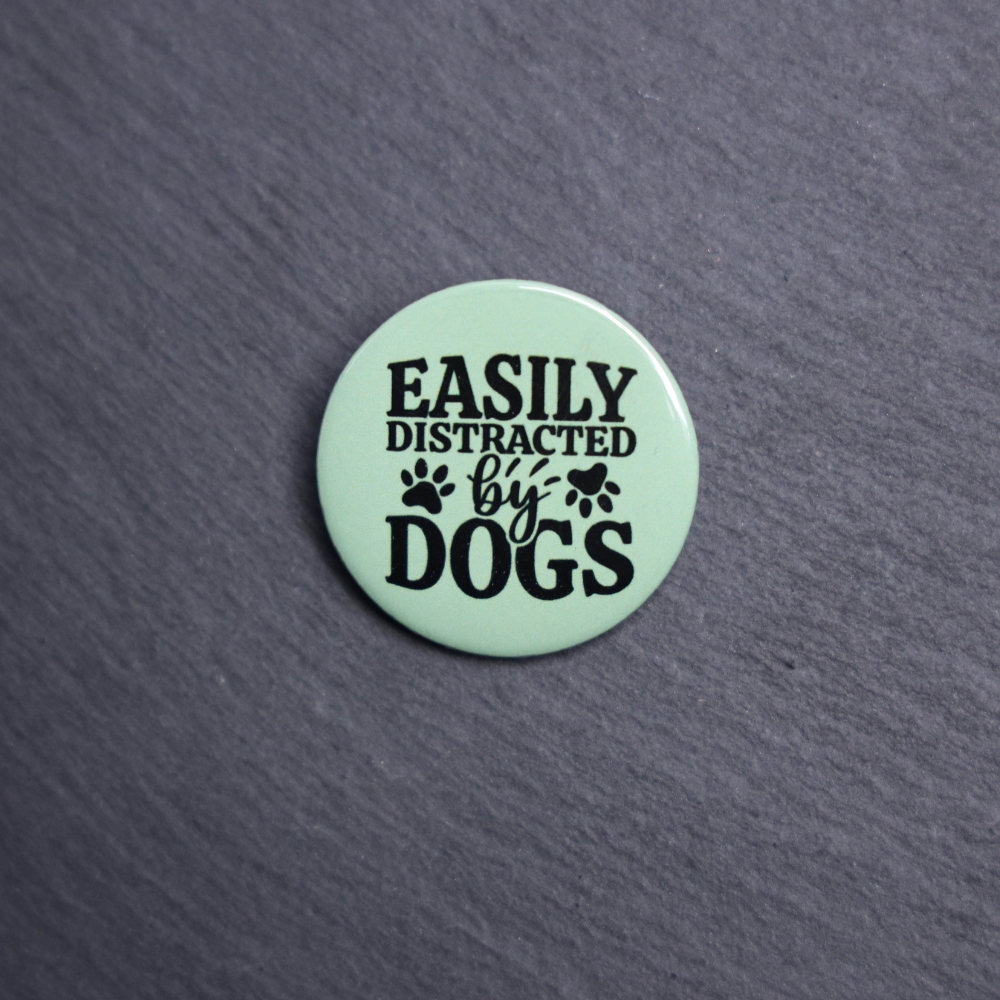 Easily Distracted By Dogs Button. These buttons are made with photo paper, metal round, and metal backing. These buttons are vibrant and fun to use on bags or vests.