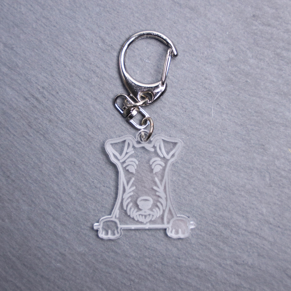 Fox Terrier Bag Tag. This bag tag is made with engraved acrylic. Comes with lobster clasp topper that easily hooks to a bag, zippers, keychains, and lanyards for fun display and swivels. Clear opposite backside.