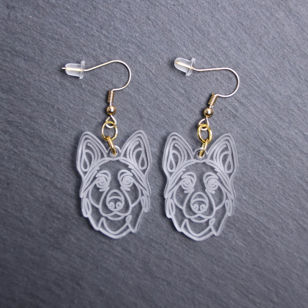 German Shepherd Earrings. These earrings are made with engraved acrylic. Comes with gold hooks that is nickel free. Adorable dangle earrings for dog lovers.