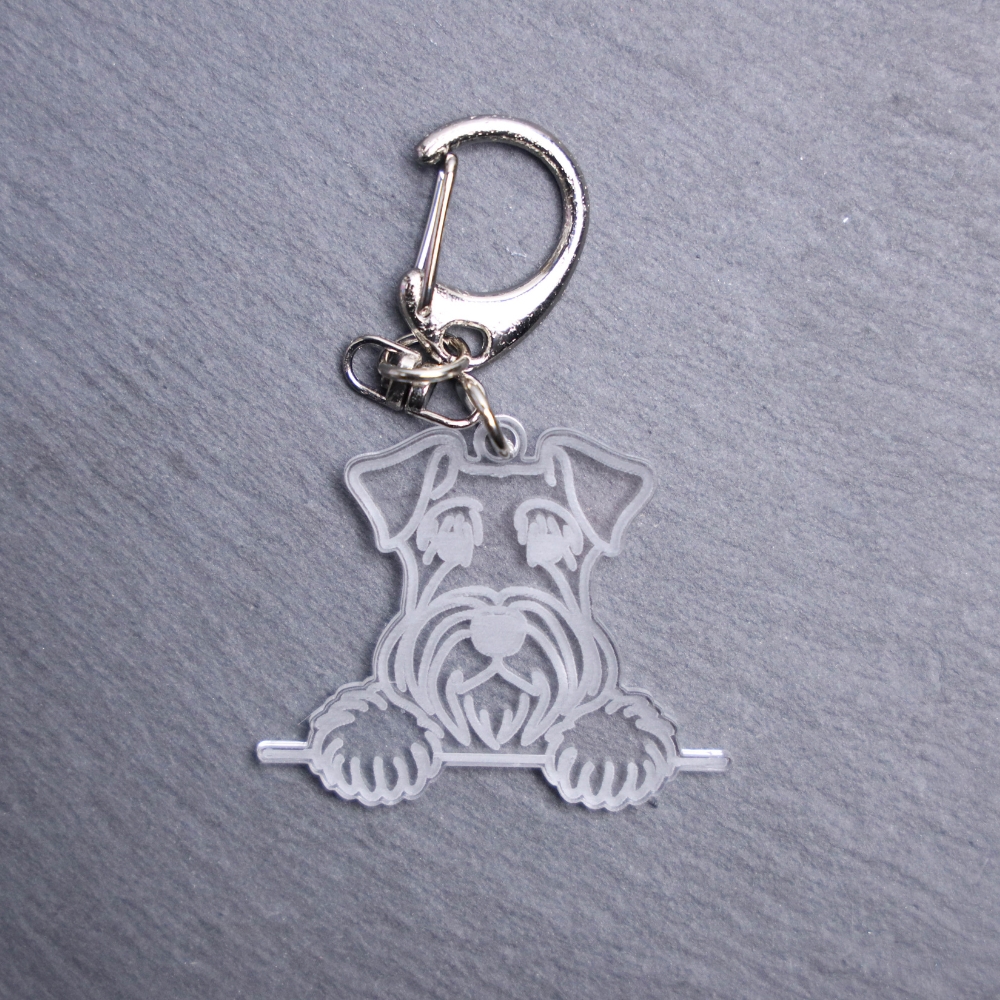Giant Schnauzer Bag Tag. This bag tag is made with engraved acrylic. Comes with lobster clasp topper that easily hooks to a bag, zippers, keychains, and lanyards for fun display and swivels. Clear opposite backside.