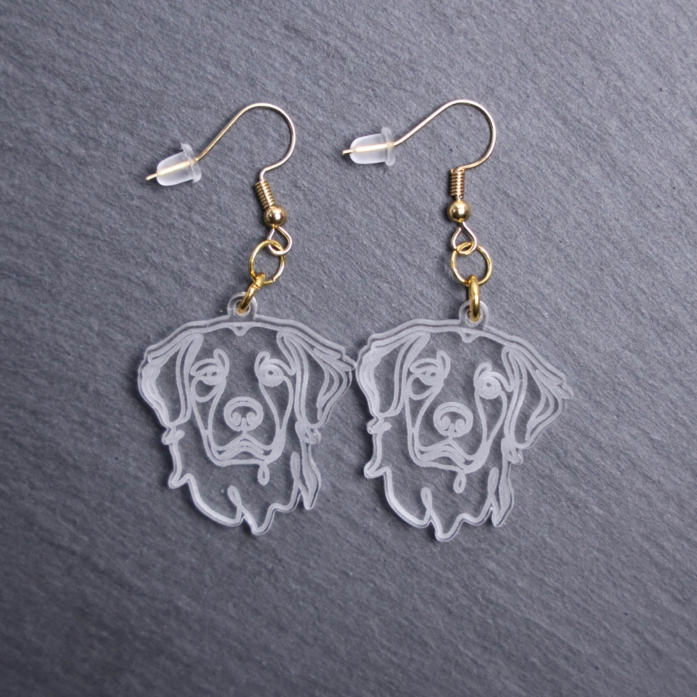 Golden Retriever Earrings. These earrings are made with engraved acrylic. Comes with gold hooks that is nickel free. Adorable dangle earrings for dog lovers.