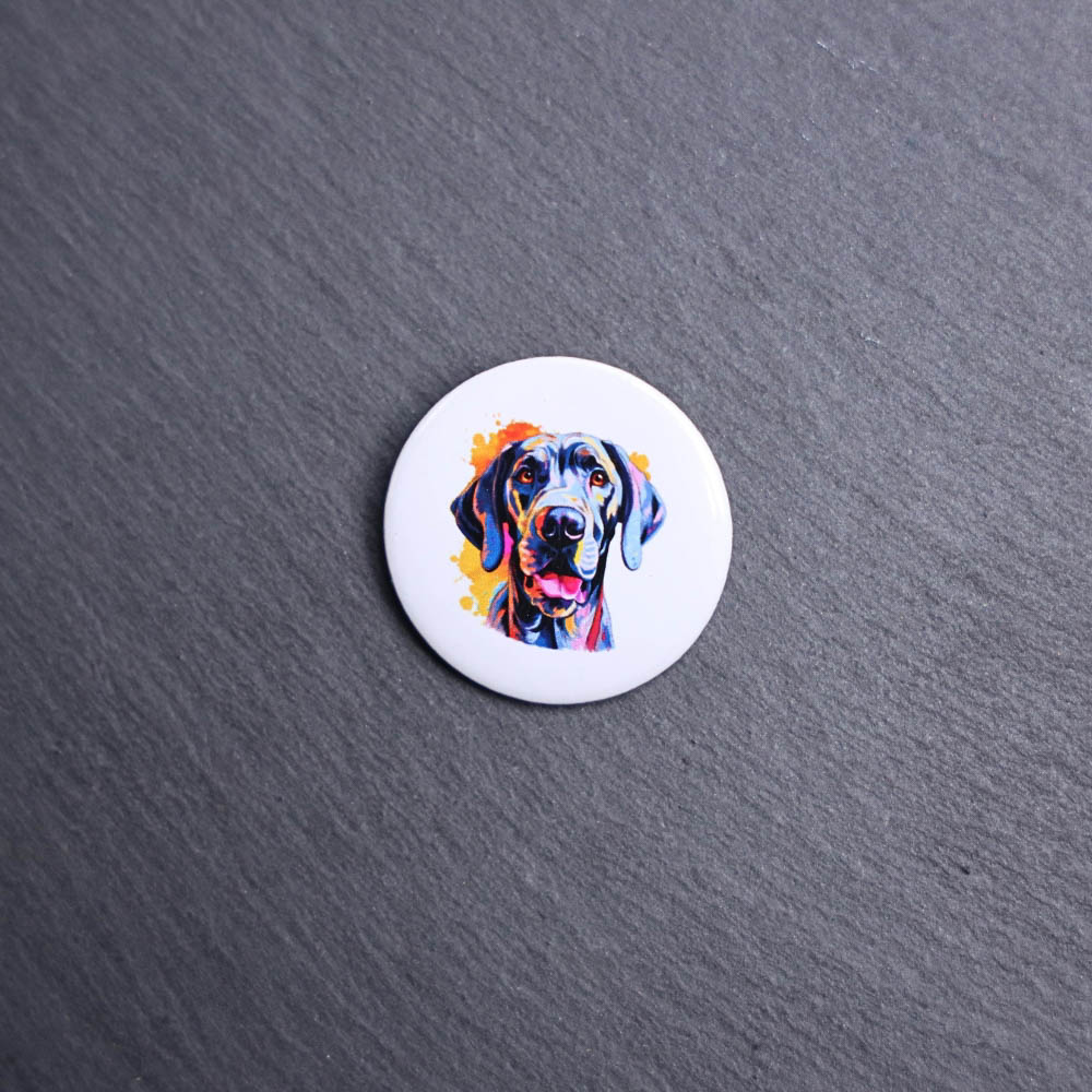 Great Dane Watercolor Button. These buttons are made with photo paper, metal round, and metal backing. These buttons are vibrant and fun to use on bags or vests.