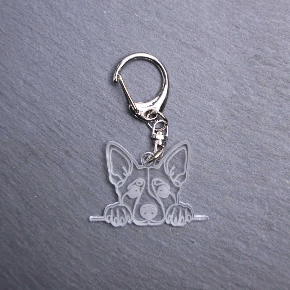 Heeler Bag Tag. This bag tag is made with engraved acrylic. Comes with lobster clasp topper that easily hooks to a bag, zippers, keychains, and lanyards for fun display and swivels. Clear opposite backside.