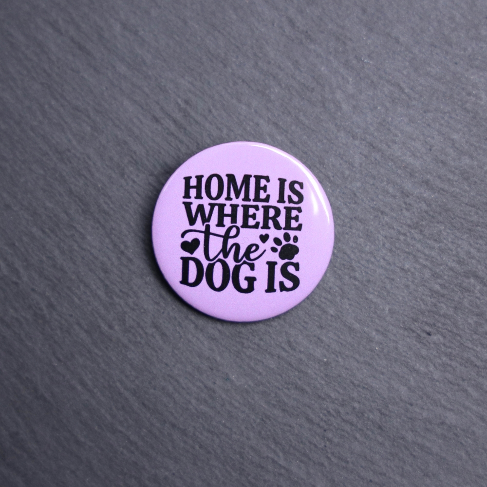 Home Is Where The Dog Is Button. These buttons are made with photo paper, metal round, and metal backing. These buttons are vibrant and fun to use on bags or vests.
