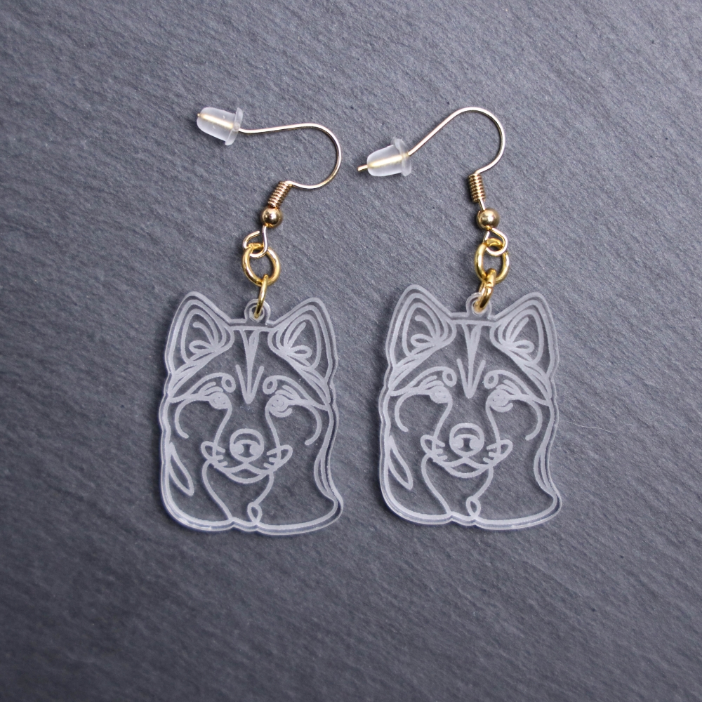 Huskita Earrings. These earrings are made with engraved acrylic. Comes with gold hooks that is nickel free. Adorable dangle earrings for dog lovers.