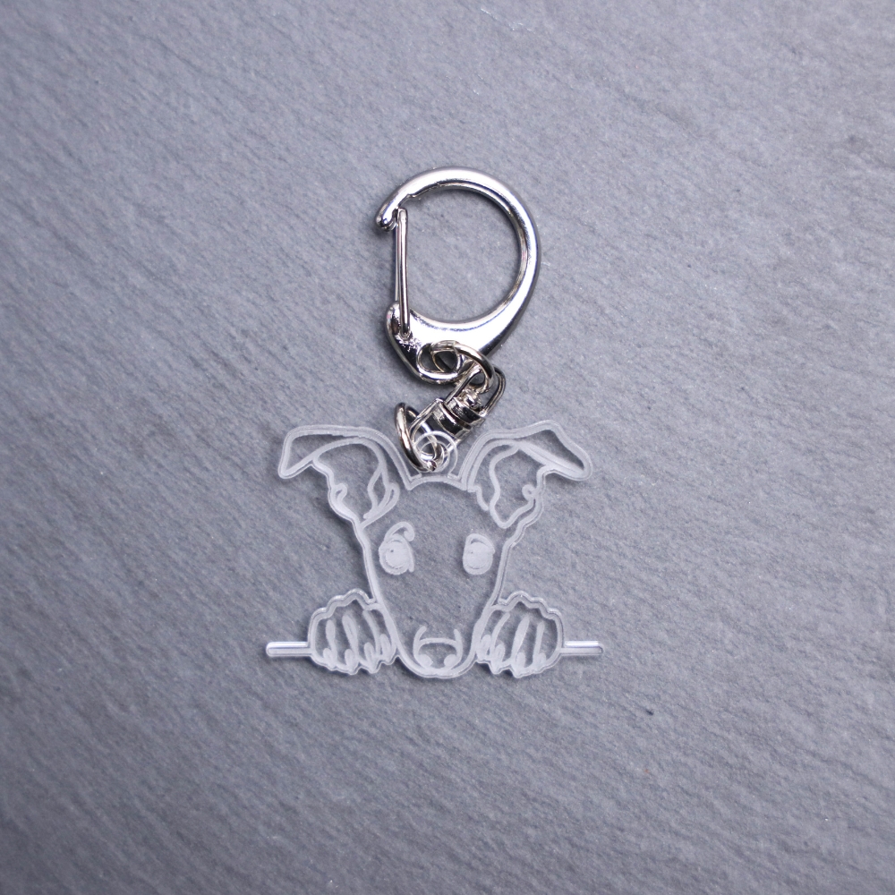 Ibizian Hound Bag Tag. This bag tag is made with engraved acrylic. Comes with lobster clasp topper that easily hooks to a bag, zippers, keychains, and lanyards for fun display and swivels. Clear opposite backside.