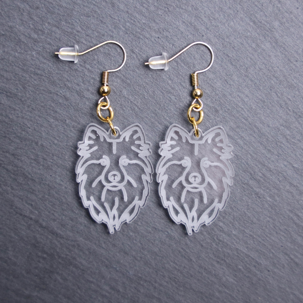 Icelandic Sheepdog Earrings. These earrings are made with engraved acrylic. Comes with gold hooks that is nickel free. Adorable dangle earrings for dog lovers.