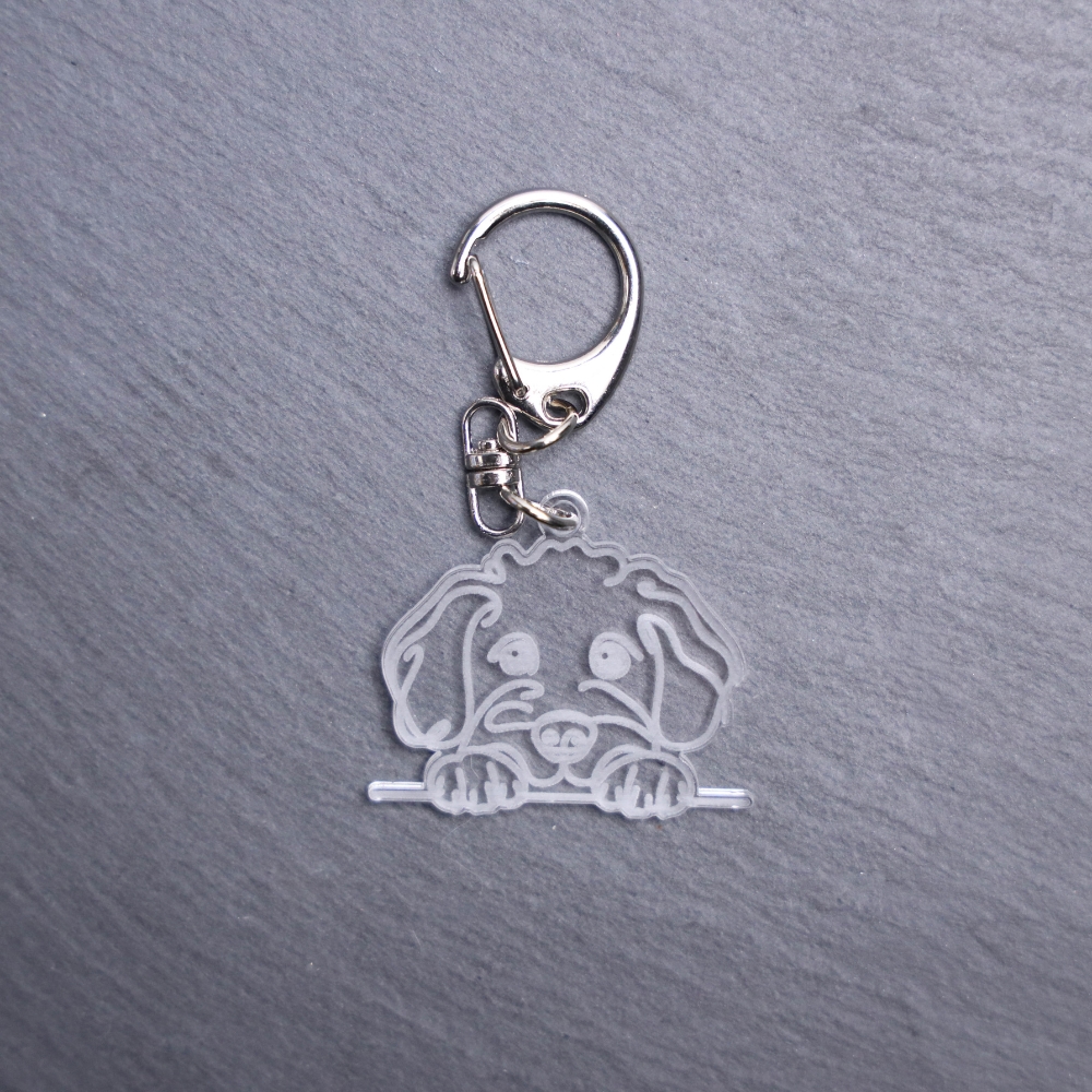 Irish Doodle Bag Tag. This bag tag is made with engraved acrylic. Comes with lobster clasp topper that easily hooks to a bag, zippers, keychains, and lanyards for fun display and swivels. Clear opposite backside.