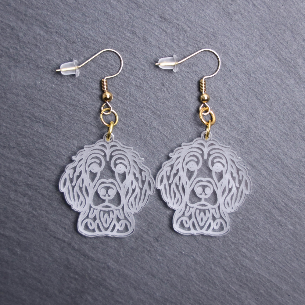 Irish Doodle Earrings. These earrings are made with engraved acrylic. Comes with gold hooks that is nickel free. Adorable dangle earrings for dog lovers.