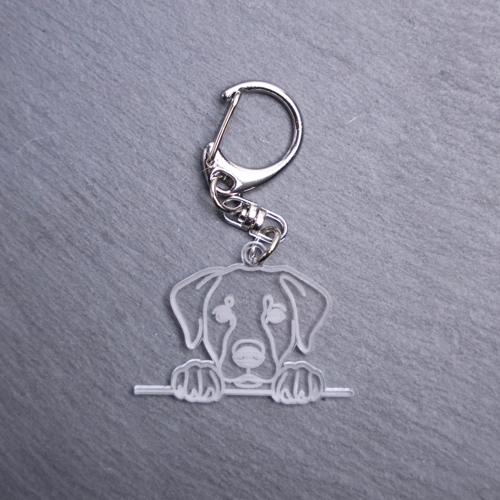 Lab Shepherd Mix Bag Tag. This bag tag is made with engraved acrylic. Comes with lobster clasp topper that easily hooks to a bag, zippers, keychains, and lanyards for fun display and swivels. Clear opposite backside.