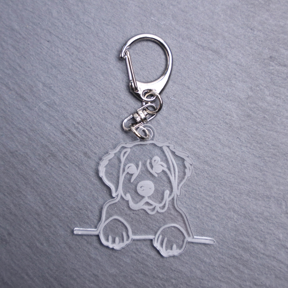 Labernese Bag Tag. This bag tag is made with engraved acrylic. Comes with lobster clasp topper that easily hooks to a bag, zippers, keychains, and lanyards for fun display and swivels. Clear opposite backside.