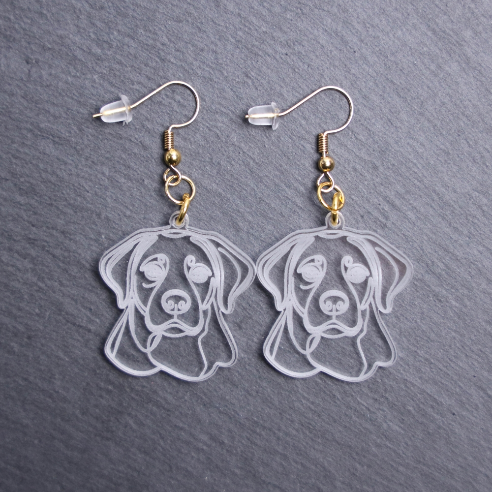 Labrador Earrings. These earrings are made with engraved acrylic. Comes with gold hooks that is nickel free. Adorable dangle earrings for dog lovers.