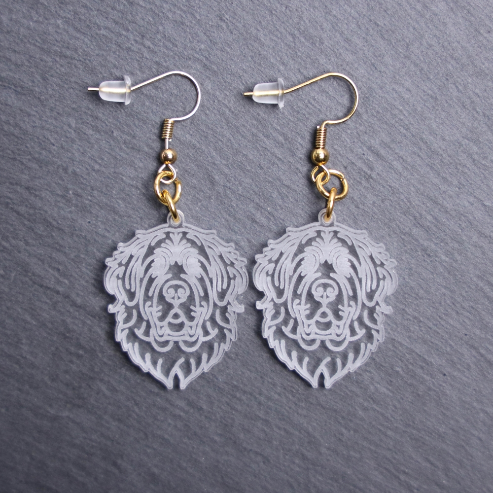 Leonberger Terrier Earrings. These earrings are made with engraved acrylic. Comes with gold hooks that is nickel free. Adorable dangle earrings for dog lovers.