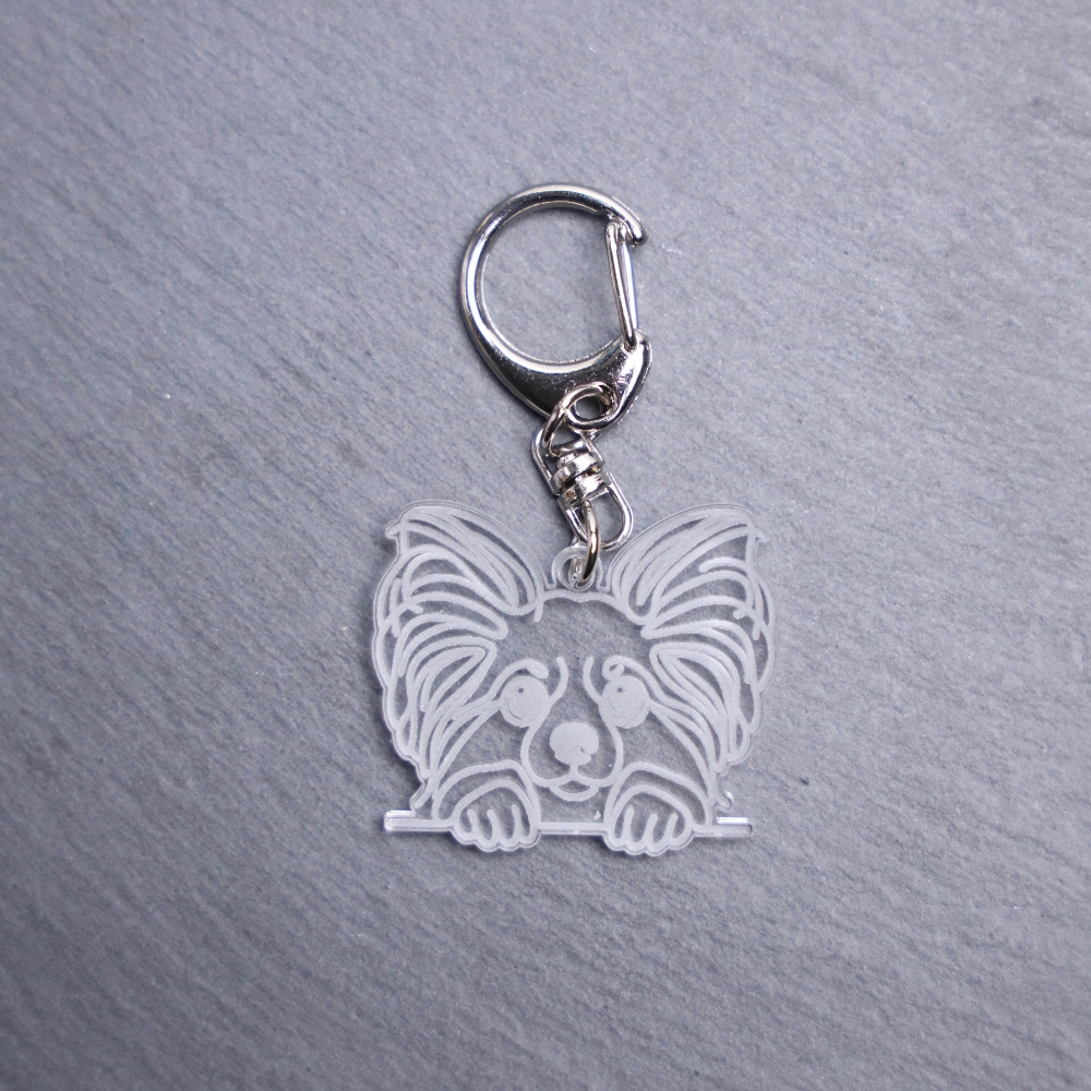 Papillon Bag Tag. This bag tag is made with engraved acrylic. Comes with lobster clasp topper that easily hooks to a bag, zippers, keychains, and lanyards for fun display and swivels. Clear opposite backside.