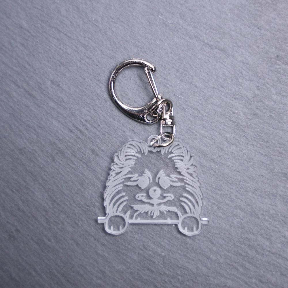 Pomeranian Bag Tag. This bag tag is made with engraved acrylic. Comes with lobster clasp topper that easily hooks to a bag, zippers, keychains, and lanyards for fun display and swivels. Clear opposite backside.