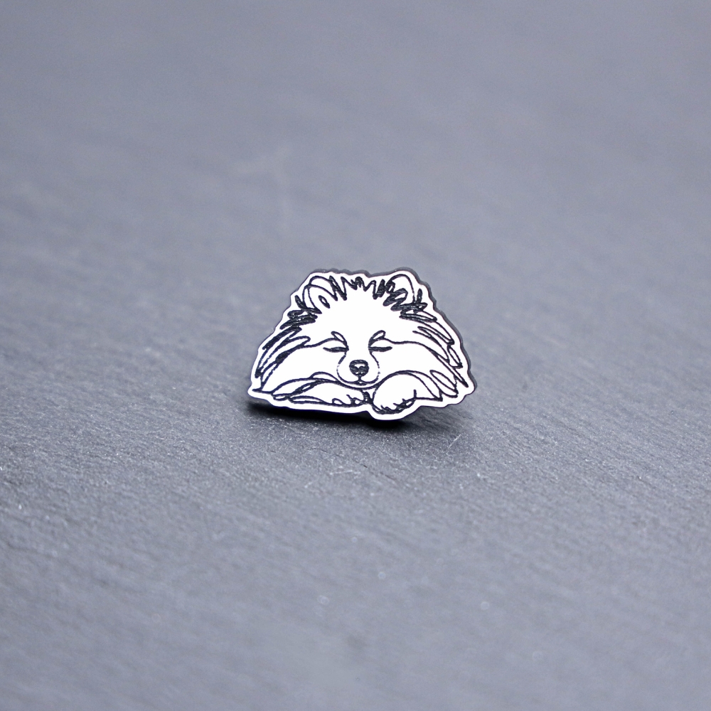 Pomeranian Engraved Acrylic Pin. These acrylic pins are made with engraved cast acrylic. These pins are white and black with a black pin back.