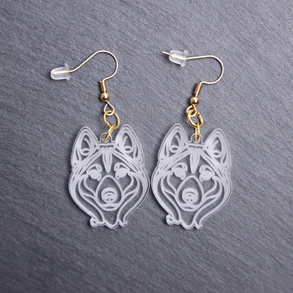 Siberian Husky Earrings. These earrings are made with engraved acrylic. Comes with gold hooks that is nickel free. Adorable dangle earrings for dog lovers.