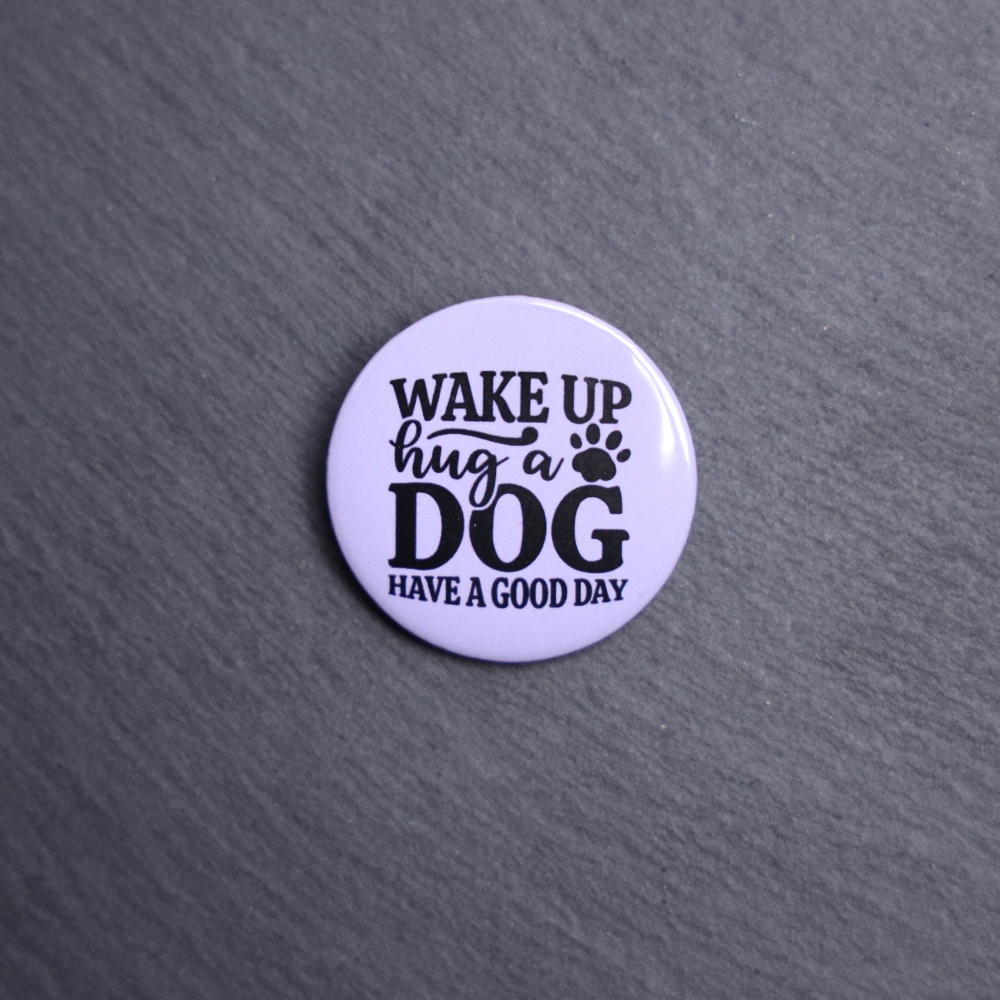 Wake Up Hug A Dog Have A Good Day Button. These buttons are made with photo paper, metal round, and metal backing. These buttons are vibrant and fun to use on bags or vests.