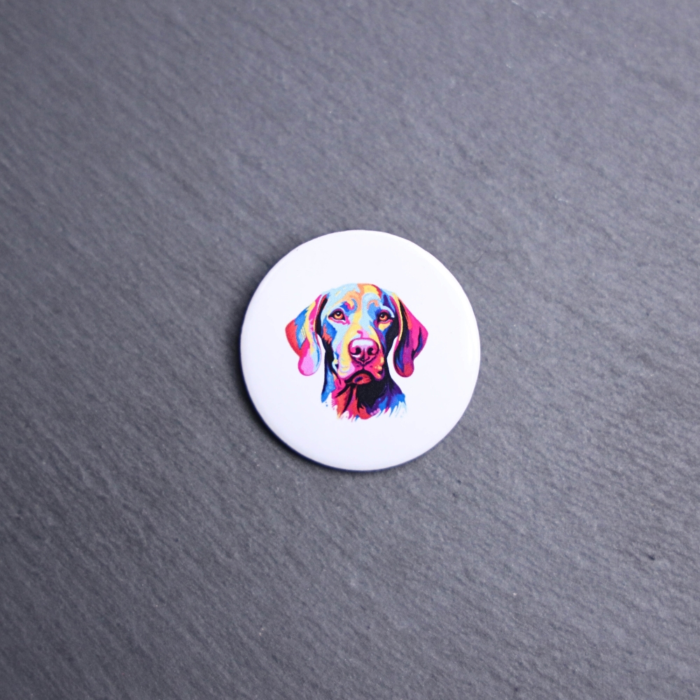 Weimaraner Watercolor Button. These buttons are made with photo paper, metal round, and metal backing. These buttons are vibrant and fun to use on bags or vests.