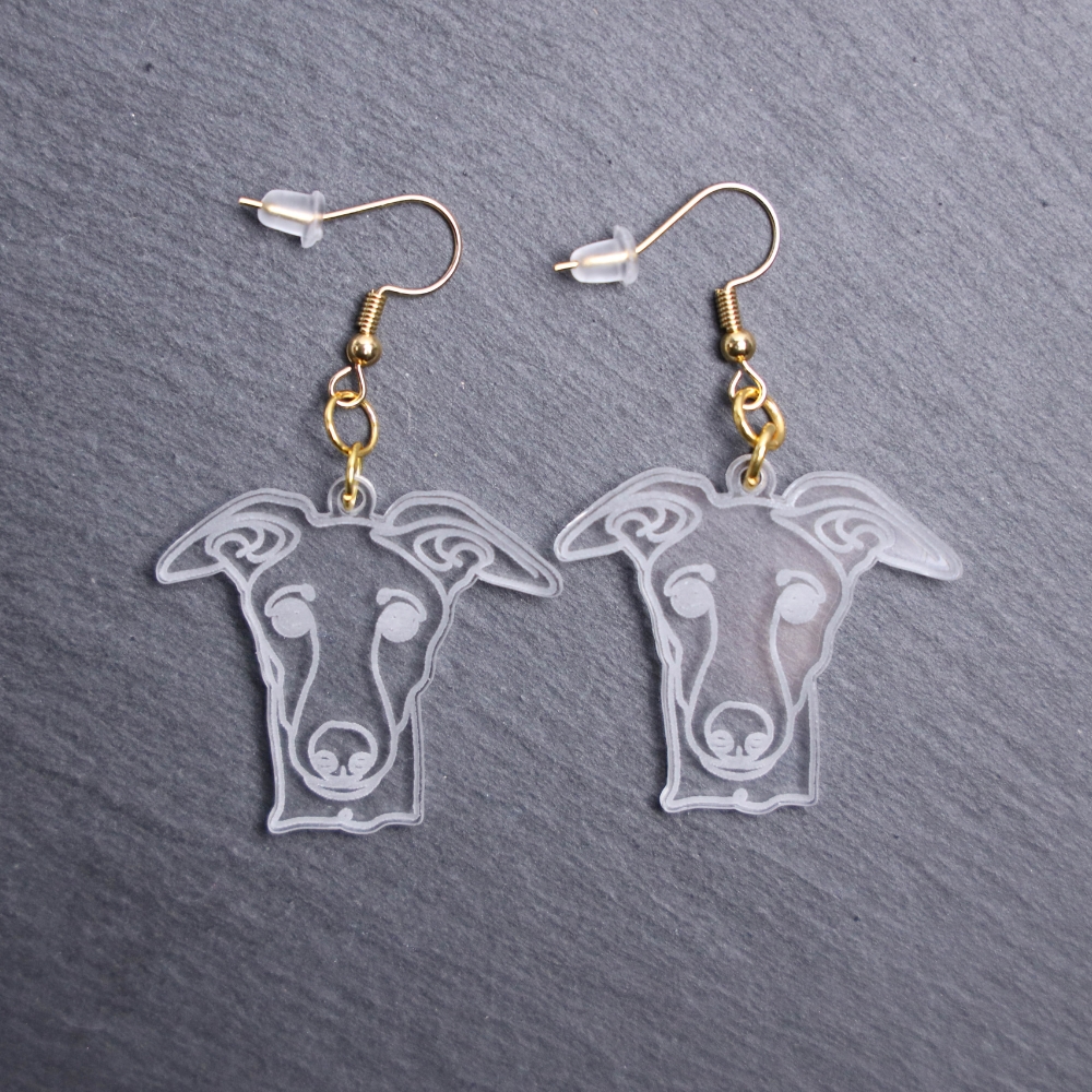Whippet Earrings. These earrings are made with engraved acrylic. Comes with gold hooks that is nickel free. Adorable dangle earrings for dog lovers.